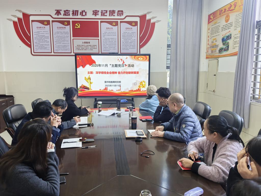 11月11日,图书馆直属党支部在会议室组织召开了“深学细悟全会精神 奋力开创崭新篇章”十一月主题党日活动。活动由党支部书记方基志主持,全体党员参加。