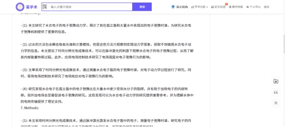 文章详细页面,点击论文对话,用ai来解读论文。如果平台没有全文下载地址,用户可上传pdf来进行对话,大模型会根据全文内容自动生成综述、文章脉络图、问答,并对全文进行翻译。自动生成提问问题并可对文献全文翻译。