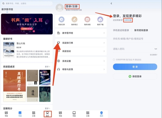 进入图书馆专属书城点击“我的”—“注册登录”,输入手机号注册即可。