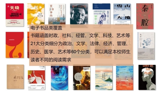 中文学术电子图书持续上新,收集中文电子图书,专业书占比超过6万册,近五年电子图书超过5万册,近3年电子图书超过3万册。由各学科教授推荐出各学科和专业的经典书籍,与高校学科设置相匹配。与多个人文学院合作,由教授团队梳理并推荐适合学生阅读的人文经典著作。