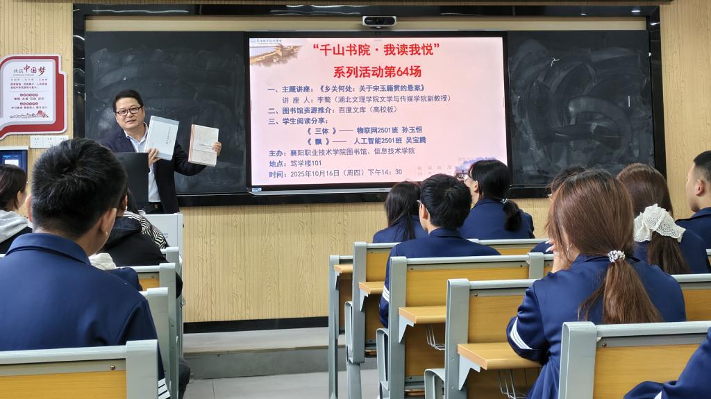 10月16日下午,“千山书院・我读我悦”系列活动第64场在笃学楼举办。学校图书馆特别邀请湖北文理学院李骜教授,围绕“乡关何处:关于宋玉籍贯的悬案”主题展开精彩专题讲座。
