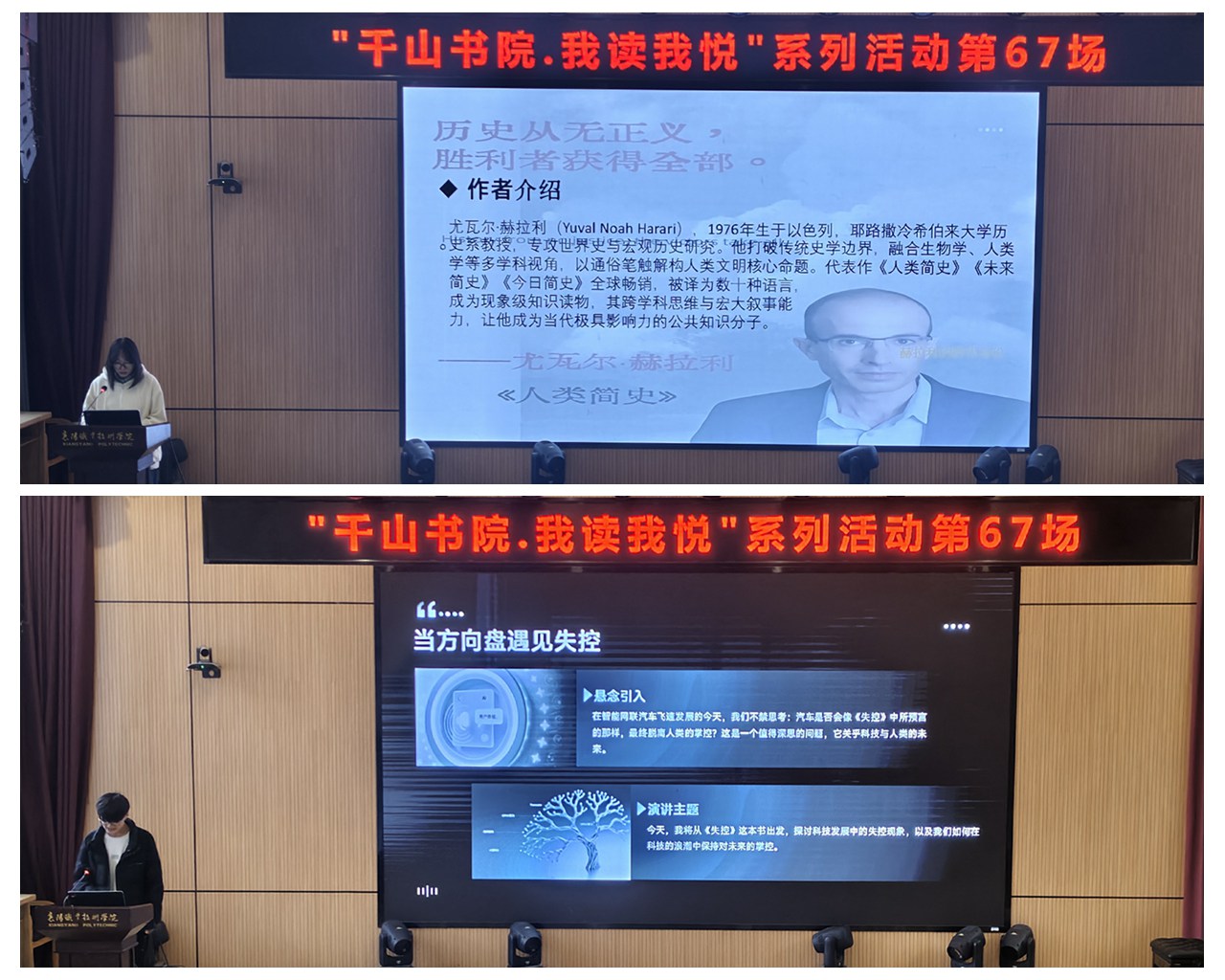 讲座后,培训讲师祝经理介绍了学校图书馆电子资源“中文在线书香中国”的使用方法,为学生拓展阅读渠道提供了实用指导。汽车工程学院机械 2501 班罗韵婕、智能网联汽车技术2502班吴宜峰分别分享了《人类简史》《失控》的阅读感悟,延续了活动的阅读氛围。