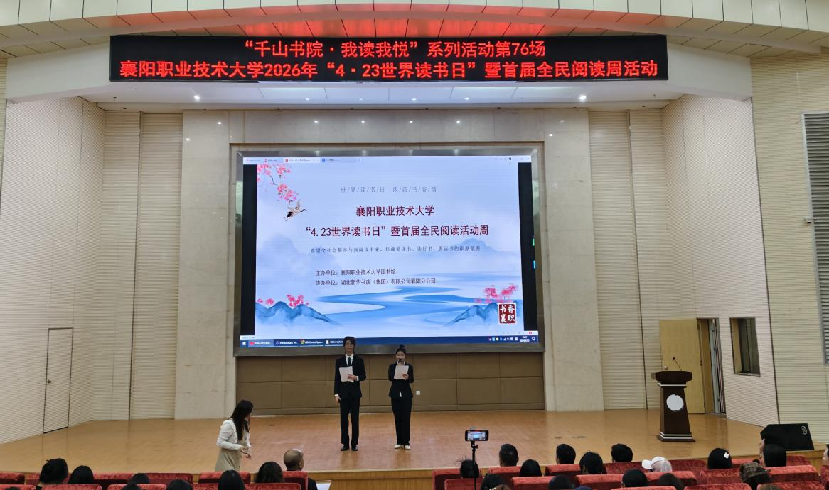 4月23日下午,襄阳职业技术大学2026年“4・23 世界读书日”暨首届全民阅读周活动在图书馆二号学术报告厅成功举办。本次活动由校图书馆主办、湖北新华书店襄阳分公司协办,深入学习贯彻习近平总书记关于全民阅读的重要论述,营造爱读书、读好书、善读书的校园风尚。